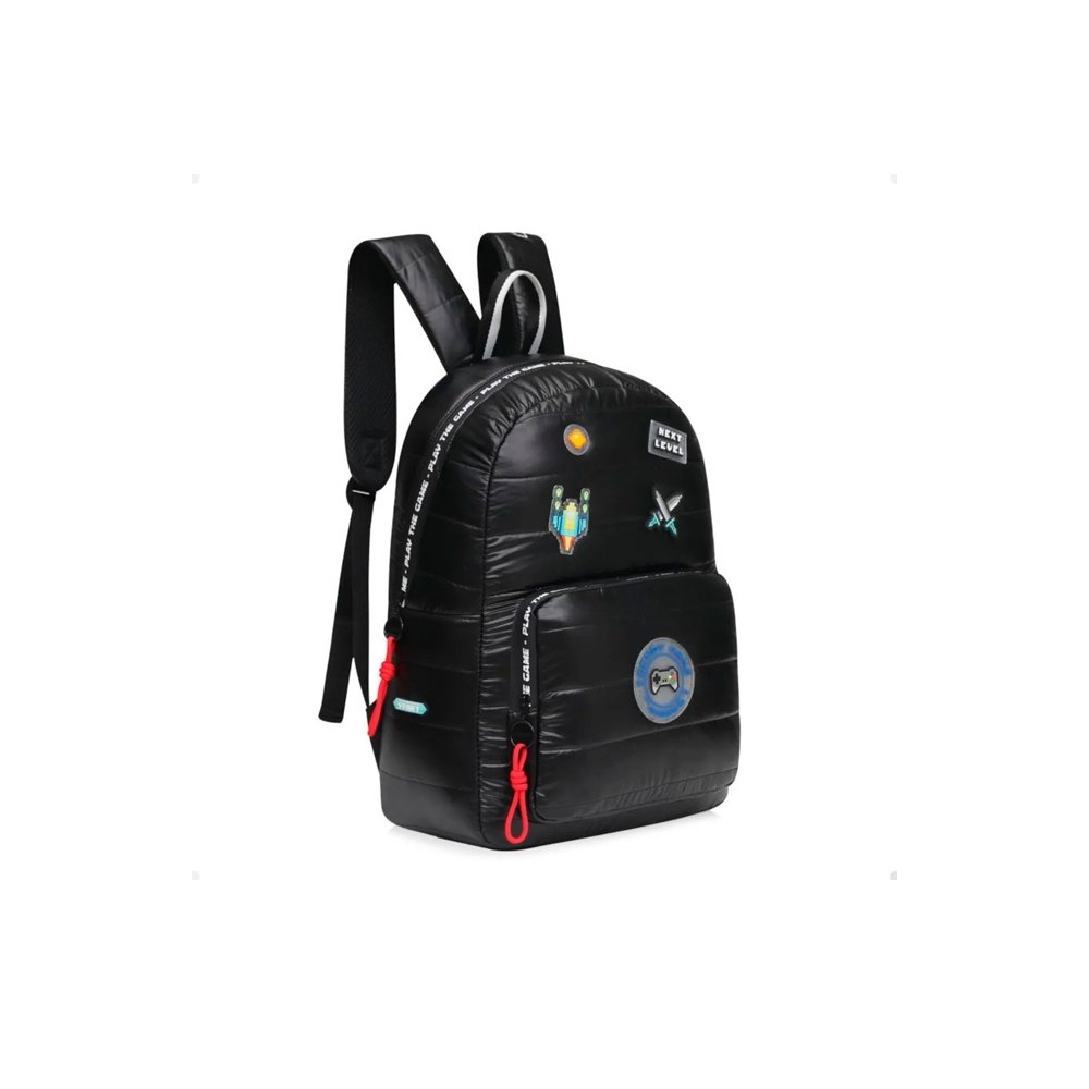 La mochila Trendy gamer negra 17630 ofrece un look sobrio pero con todo el carácter del mundo gaming. Está confeccionada en nylon tipo puffer con acabado acolchado y luce detalles metalizados de videojuegos en el frente, combinando estilo urbano con personalidad geek.